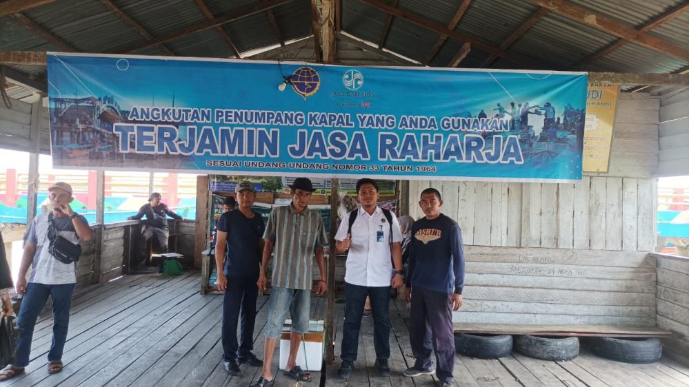 JAMBI - Jasa Raharja Jambi Pasang Spanduk Angkutan Penumpang Kapal Di Pelabauhan H. Abas Terjamin Uu No 33 Tahun 1964, Sabtu, 3 Juni 2023. Pemasang sepanduk dilakukan oleh Penanggung Jawab Samsat Kuala Tungkal didampingin agen pelayaran. Perjanjian Kerjasama PT. Jasa Raharaja Cabang Jambi dengan pemilik kapal yang beroperasional di Pelabuhan Abbas ditandatangani pada 22 Januari 2020.