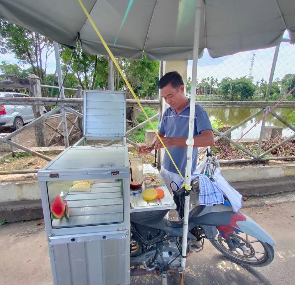 Halojambinews : Kalau kita melewati jalur dua Sultan Thaha Muara Bulian, persis di depan pintu gerbang Taman Bebekan, pasti akan terlihat penjual rujak buah. Ya, penjual rujak buah tersebut bernama M. Sabran (51), warga Pal 3 Muara Bulian. Rujak buah ya maknyus dan gurih.