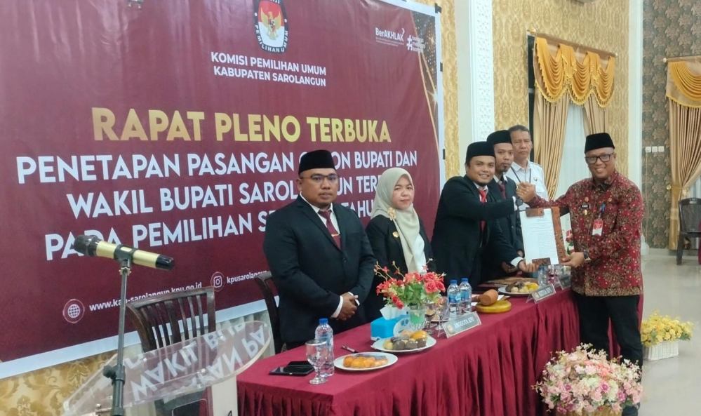 Rapat pleno terbuka yang dilaksanakan oleh KPU bertempat di Golden Hotel Sarolangun dihadiri Bupati Sarolangun terpilih H. Hurmin, dan Wakil Bupati terpilih Gerry Trisatwika, Cek Marleni Waka l DPRD Kabupaten Sarolangun, Pabung Sarko Walikota Tedi Aprizal, Kasi Intel Kejari Rikson Siagian SH, ketua Pengadilan negeri Sarolangun Novarina Manurung, dan para pimpinan Partai Pengusung pasangan Hurmin-Gerry.